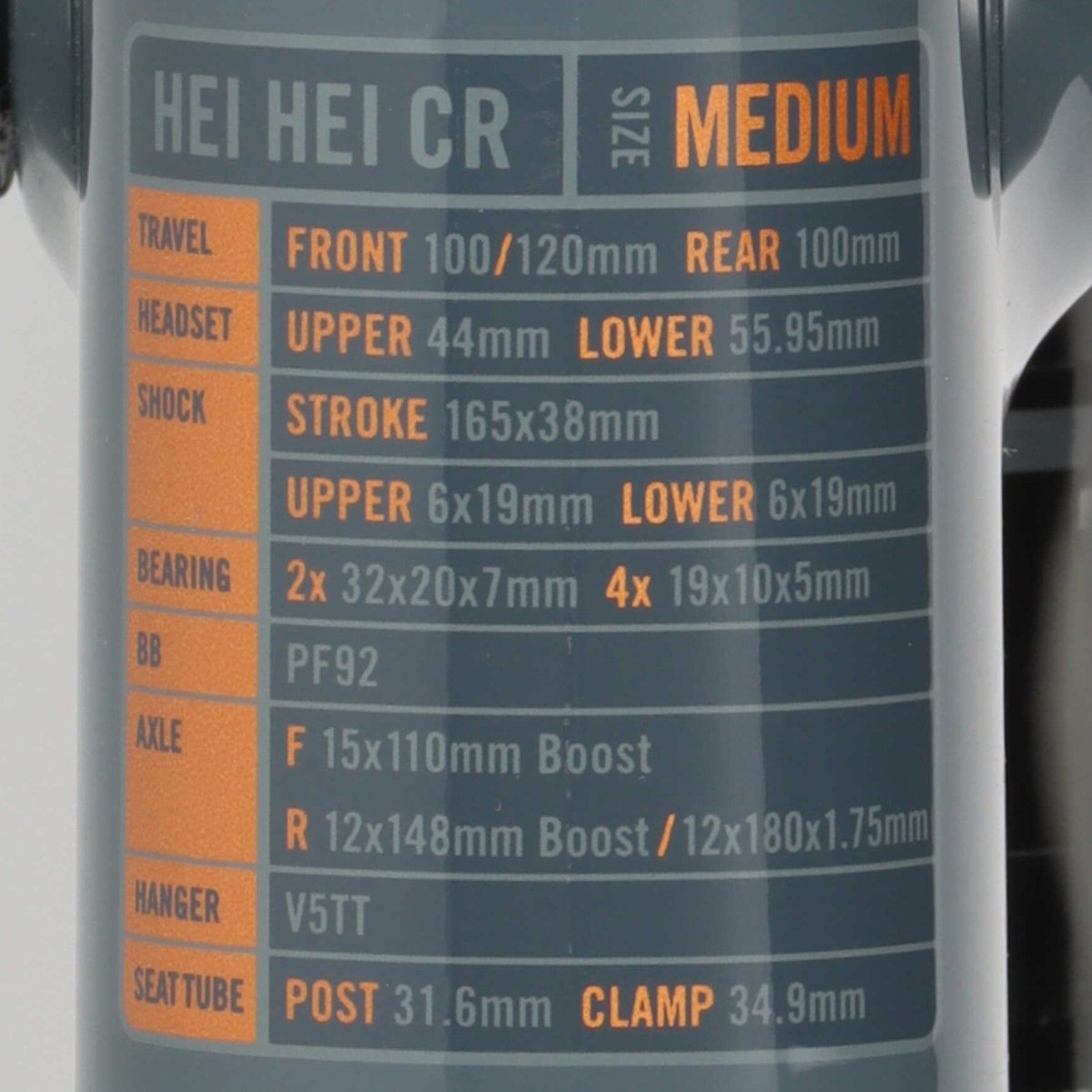 Der Rahmen ist für eine 31,6 mm Sattelstütze mit 34,9 mm Sattelklemme ausgelegt. Mit einem Gewicht von nur 2210 g zählt der Hei Hei CR DL zu den besonders leichten Fully-Rahmen seiner Klasse.