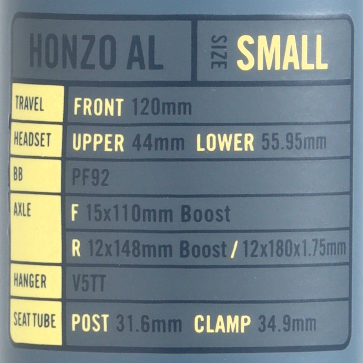 Der Rahmen nutzt eine Sattelstütze mit 31,6 mm Durchmesser und eine Sattelklemme mit 34,9 mm. Mit einem Gewicht von nur ca. 1745 g zählt der Honzo zu den besonders leichten Aluminium-Hardtailrahmen seiner Klasse.